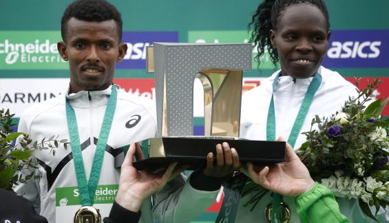 El etíope Abeje Ayana y la keniana Helaba Kiprop se impusieron este domingo en el maratón de París, una carrera disputada en condiciones difíciles por la lluvia y el viento.