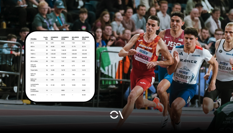 Por ejemplo, en los 60 metros lisos, la mínima WA para hombres es de 6.59, mientras que la RFEA fija su estándar en 6.62; en mujeres, el listón queda en 7.22. En pruebas de medio fondo, los hombres deberán acreditar 3:36.80 en 1500 m o 1:46.20 en 800 m, y las mujeres 4:06.90 y 2:01.30, respectivamente.