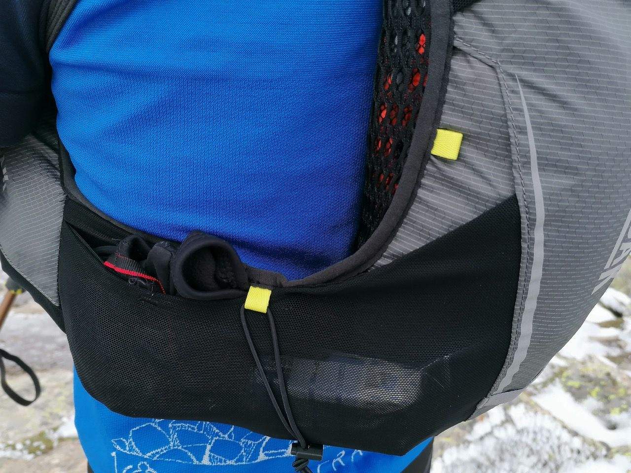 En su parte frontal izquierda disponemos de un bolsillo con cremallera con otro más pequeño en su interior. Este bolsillo no está protegido ni contra sudor ni es impermeable así que ojo con lo que ponemos dentro, es el sitio ideal para llaves y móvil aunque de más de 6” no cabe. Dos bolsillos para los bidones blandos, Quick Stow incluidos con la mochila, uno a cada lado con una presilla para ajustarlos y un cordón elástico que impide se salga el flask. Sorprende su posición más horizontal que vertical con la inclinación justa para beber cómodamente sin tener que sacarlos.