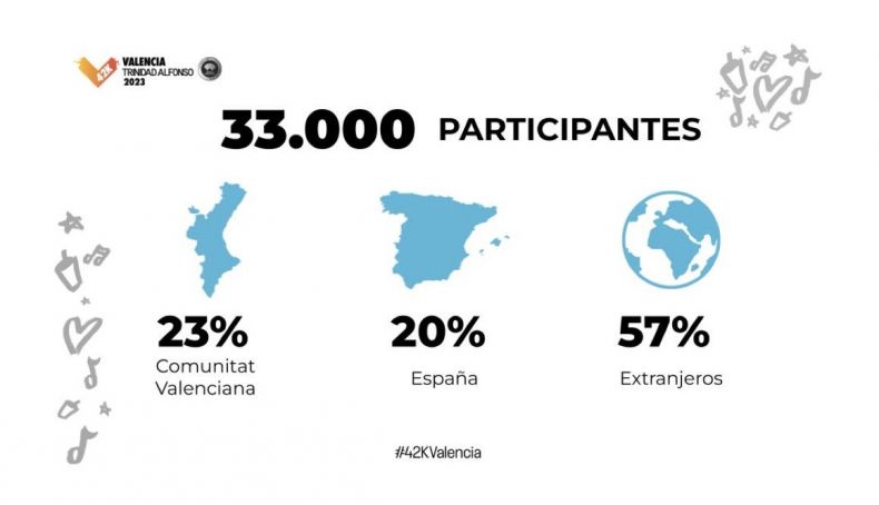 La organización de la prueba, a cargo de la SD Correcaminos y el Ajuntament de Valencia, ha presentado este lunes los espectaculares datos turísticos de esta 43ª edición, en la que destaca que el 57% de los corredores inscritos provienen de fuera de España, aumentando el porcentaje del año pasado y demostrando la internacionalización de la carrera, que contará este año con participantes de 134 países diferentes (frente a los 124 de 2022).