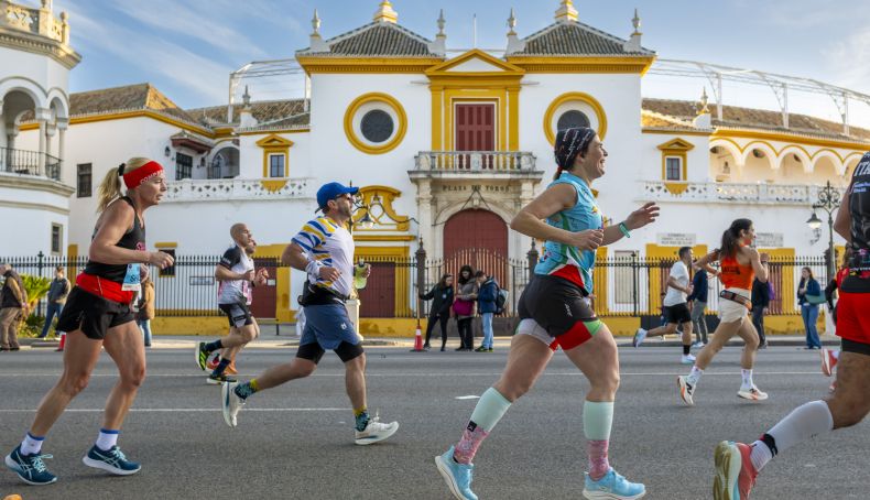 Corredores del Zurich Maratón de Sevilla al paso por la Maestranza