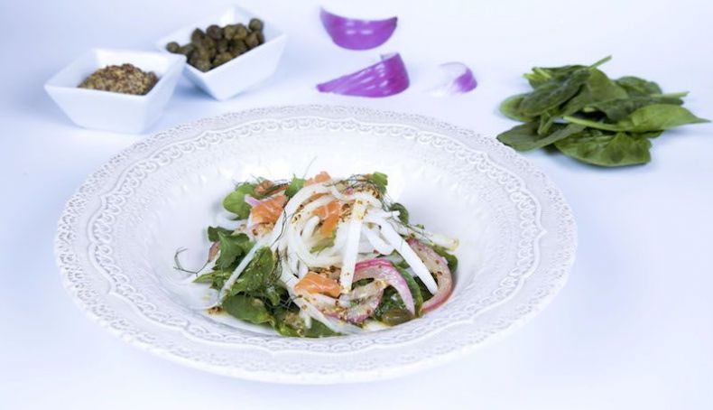 Salmón ahumado con tallarines de nabo y salsa de eneldo